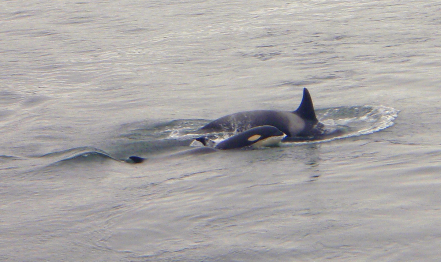 Last weekend while waiting for our ferry to cast off from Swartz Bay, Sidney, BC, a pod of resident killer whales passed within 100 m of us. In all the excitement we managed only one decent photo, a female and her offspring, likely chasing dinner in the harbour.