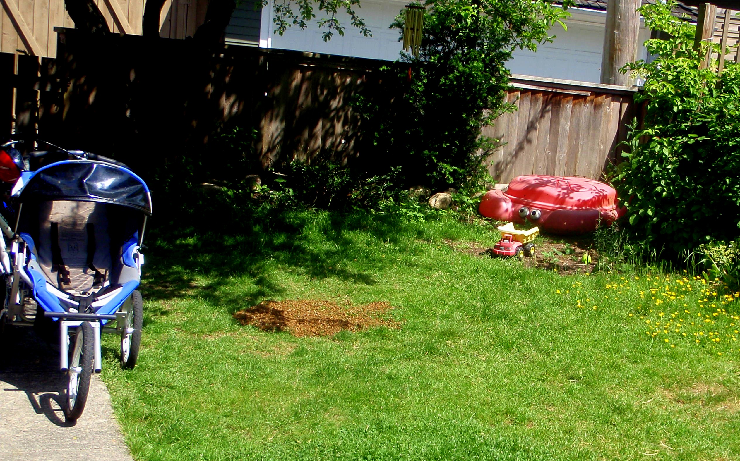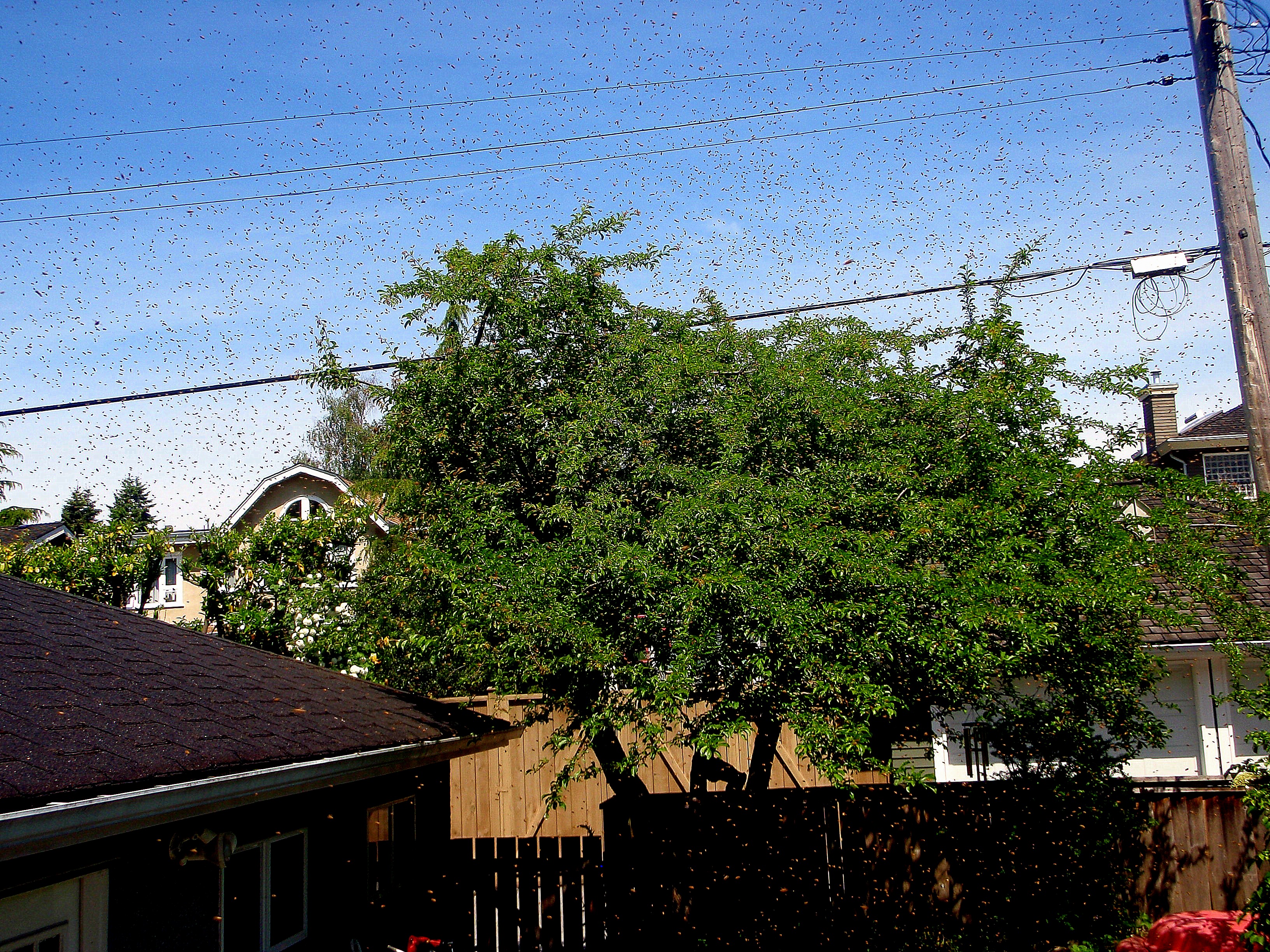 After trying out a branch in our plum tree, they dropped to the ground and settled for the next 24 hours or so. Individual bees, perhaps scouts, shuttled in and out of the cluster until sunset and then again throughout Sunday morning. Finally on Sunday evening they rose in one great cloud (well, they did leave some stragglers) and made their way to Pacific Spirit Park.