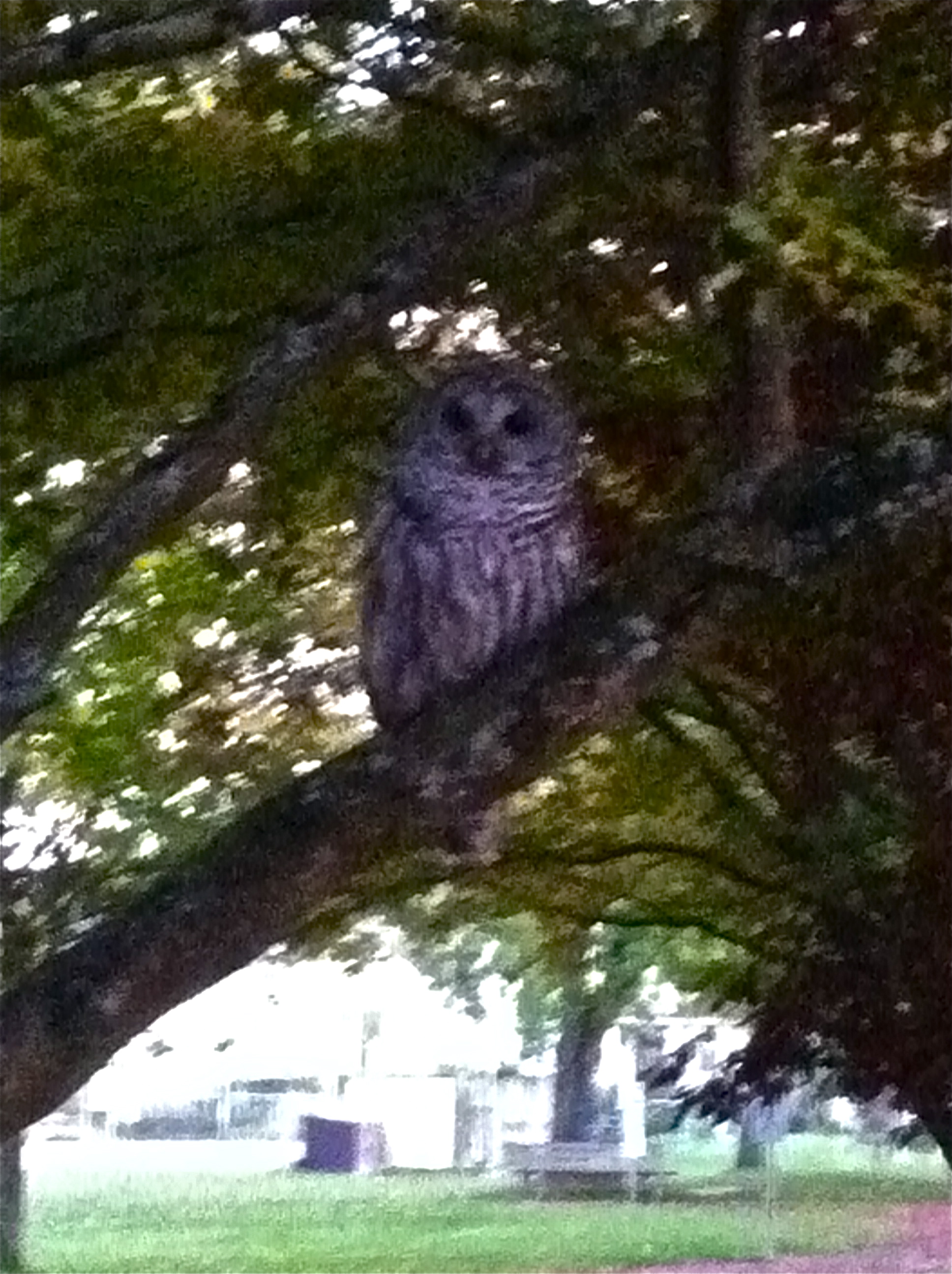 a rough image in low light, this evening we had the happy fortune of meeting a barred owl on the grounds of my kids' school, girding herself for an evening hunt.