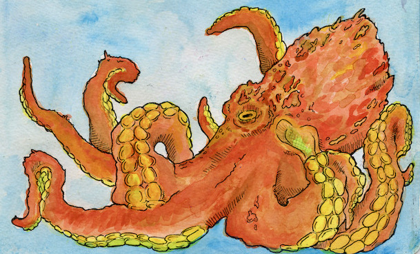 An octopus is clever – curious and playful (the scene of her playing with fish brought tears to my eyes). It fascinates me how this intelligence grew on a limb distinct and separate from us and our mammal cousins. Where we share kinship with the chimpanzee and dolphin, the octopus in her phylum is kith and kin with with snails, clams, and sea slugs.